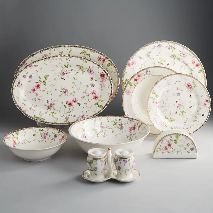 - Столовый сервиз на 6 персон из высококачественного фарфора с декоративным рисунком и золотой обводкой