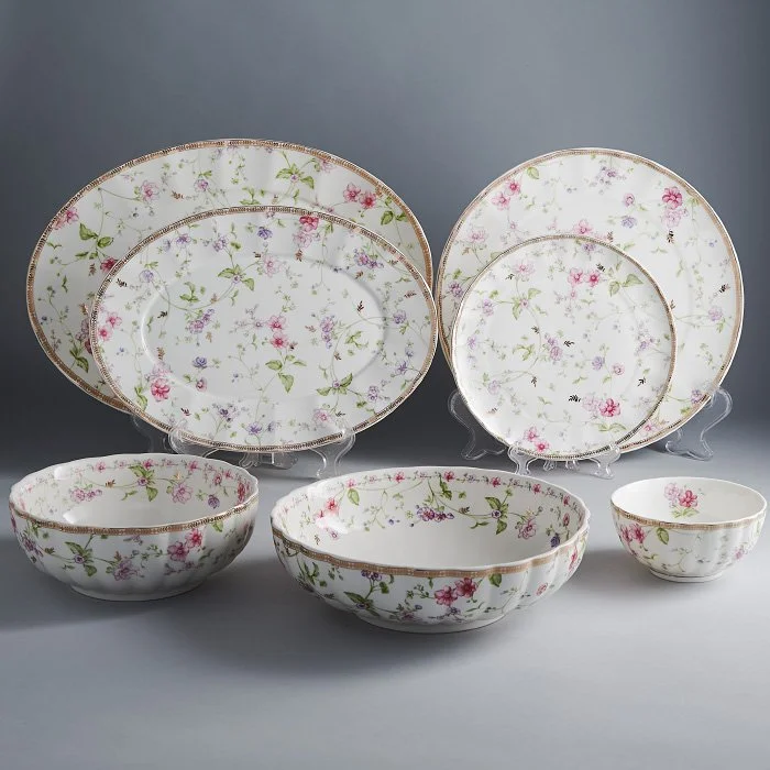 - Столовый сервиз на 12 персон из высококачественного фарфора с декоративным рисунком и золотой обводкой