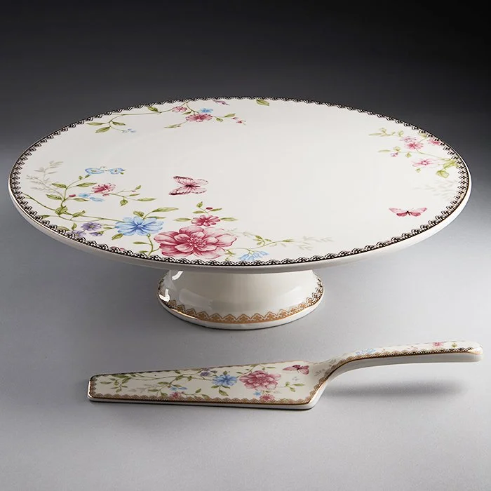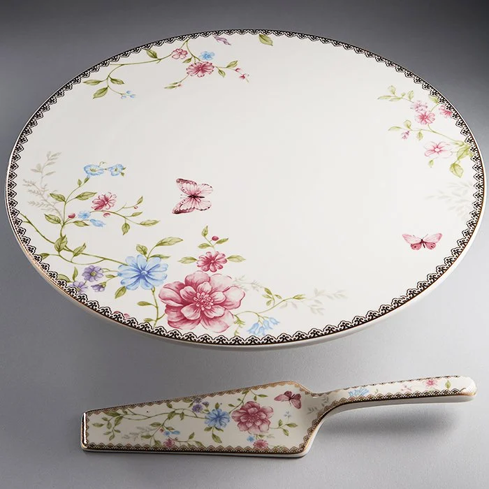 - Тортница с лопаткой из высококачественного фарфора с декоративным рисунком и золотой обводкой