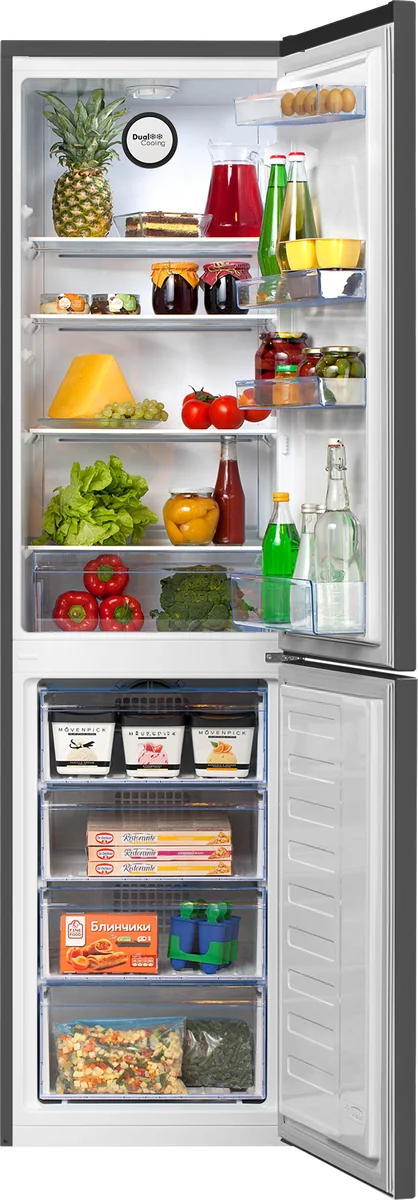 - Морозильное отделение: система No Frost, мощность замораживания: 7 кг/сутки, температура морозильной камеры min: -27 °С, max: -18 °С, 4 ящика, форма для льда.