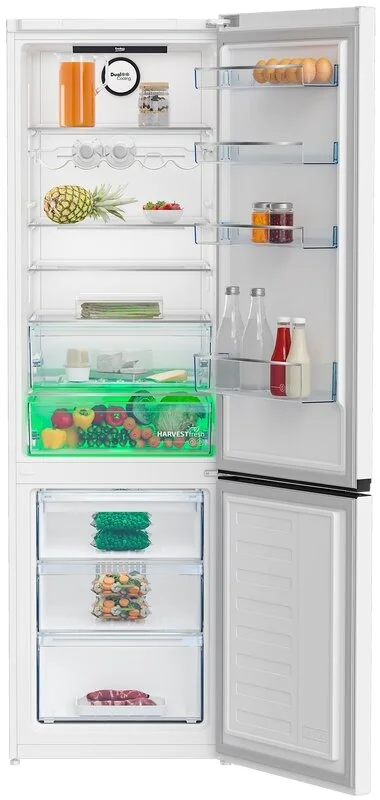 Холодильник Beko B3RCNK402HW Белый двухкамерный холодильник имеет высоту 2 метра, удобный цифровой дисплей, электронное управление и энергосберегающий режим «Отпуск». Холодильник оснащен двухконтурной системой охлаждения NoFrost Dual Cooling (Ноу Фрост), которая разделяет воздушные потоки между холодильной и морозильной камерами для лучшего охлаждения без смешивания запахов и образования льда на стенках. В холодильной камере расположены отделение для свежих фруктов и овощей с технологией трехцветной подсветки HarvestFresh и специальный отсек с температурой 0-3 °С для более долгого хранения свежего мяса, рыбы и молочных продуктов. Основные характеристики: Габариты (B/Ш/Г) (см): 201/59.5/65 Тип: двухкамерный Система размораживания: NO FROST Класс энергопотребления: А+ Морозильник: снизу Общий объем (л): 403 Количество компрессоров: 1 Цвет: белый Холодильное отделение: Полки из закаленного стекла Зона свежести 0-3°C Система No Frost (Ноу Фрост) Ящик для овощей и фруктов Технология Harvest Fresh: Инновационная технология 3-х цветов от Beko внутри отделения для фруктов и овощей воссоздает природный световой цикл, сохраняя витамины дольше. Подставка для яиц 1x10 Хромированная полка для бутылок Морозильное отделение: Система No Frost (Ноу Фрост) Время сохранения температуры без электричества: 21 ч Мощность замораживания: 6 кг/24 ч Функция суперзаморозки Quick Freeze 3 отделения Форма для кубиков льда Дополнительная информация: Дисплей Режим " Отпуск" Звуковое оповещение при открытой двери Хладагент: R600a Уровень шума: 38 дБ(А) Перенавешиваемые двери Тип ручки: Встроенная Технология NoFrost Dual Cooling Предотвращение образования льда и смешивания запахов. С системой NoFrost не нужно регулярно размораживать холодильник. А инновационная система двухконтурного охлаждения Dual Cooling позаботится, чтобы запахи в холодильной и морозильной камерах не смешивались. Технология Harvest Fresh Инновационная технология 3-х цветов от Beko внутри отделения для фруктов и овощей воссоздает природный световой цикл, сохраняя витамины дольше. Зона свежести 0-3 °С Зона, в которой поддерживается минимальная температура, которая может колебаться в диапазоне 0-3 °С. Она создает идеальные условия для хранения мяса, рыбы, курицы, колбасных изделий. Режим " Отпуск" " Умное" распределение электроэнергии. На время вашего отсутствия вы можете перевести холодильник в режим " Отпуск" и отключить холодильное отделение. Это позволит сэкономить на счете за электричество и в тоже время не беспокоиться за сохранность продуктов в морозильной камере. «Суперзаморозка» Включите этот режим, если хотите быстро заморозить продукты. В морозильной камере на время установится температура - 27°C. LED освещение Хороший обзор внутри холодильника. Бывает сложно увидеть все продукты в холодильнике, особенно в углах и возле задней стенки. LED подсветка обеспечивает превосходный обзор всей камеры и потребляет меньше электроэнергии, чем обычная подсветка. Сигнализация открытия дверцы Если дверца холодильника остается открытой дольше 1 минуты, раздаетсязвуковой сигнал. Сигнал отключается при закрытии дверцы или при нажатии любой кнопки на дисплее (при наличии такового). Кроме того, начинает мигать внутреннее освещение холодильника. Если предупреждающий сигнал длится 10 минут, внутреннее освещение холодильника отключается. Безопасное закаленное стекло Полки из высок