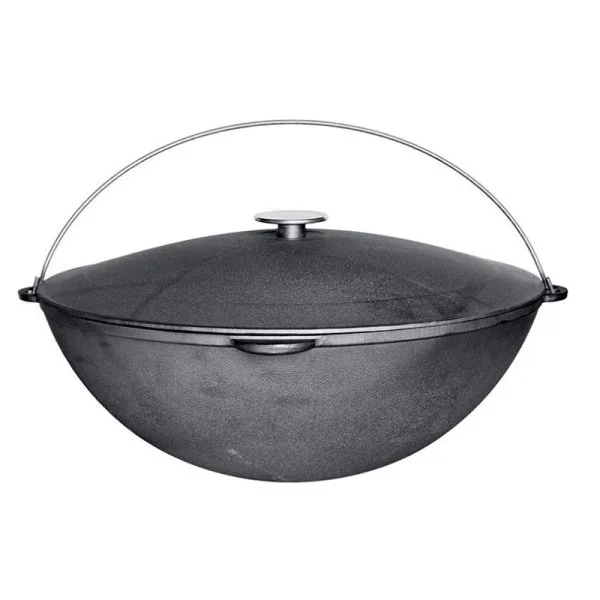 Казан татарский чугунный диаметром 36 см. и объемом 8 л. И казан, и крышка изготовлены из высококачественного литого чугуна, благодаря чему обеспечивают абсолютно равномерный нагрев со всех сторон и надолго сохраняют тепло. Благодяря удобному подвесу идеально подходит для готовки блюд на мангале или костре.