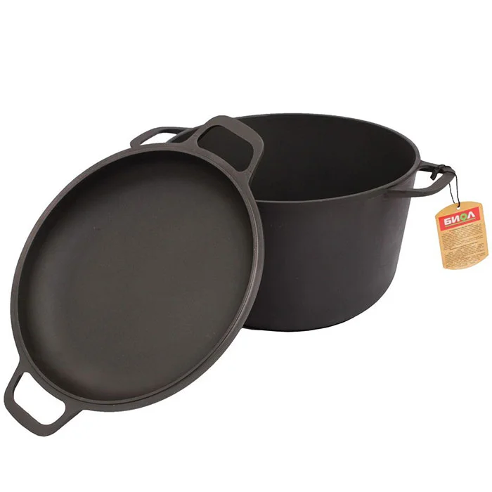 - Удобная высокая кастрюля, выполненная из высококачественного чугуна, плотно закрывается чугунной крышкой (крышка может использоваться в качестве сковороды) и оснащенная двумя удобными, прочными ручками