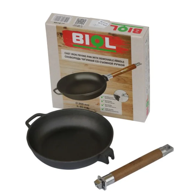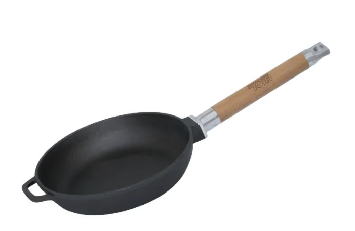 - Чугунная сковорода со съемной деревянной ручкой без крышки