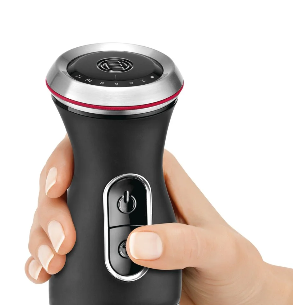 - Эргономичная форма рукоятки блендера с мягким антискользящим покрытием и большими кнопками