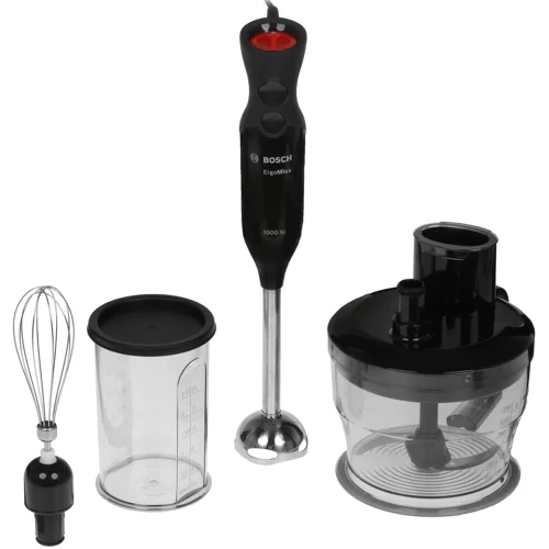 В комплект реализации, кроме блендера, венчика и измельчителя, входит насадка-комбайн со сменными лезвиями и терками. Объем чаши кухонного комбайна составляет 1.25 л, а герметичного мерного стаканчика – 0.6 л. С использованием блендера Bosch MS62B6190 получится выполнять множество кулинарных задач, включая шинковку и перетирание овощей, приготовление теста для бисквитов и блинов, пюрирование. Мыть комплектующие и насадки прибора можно как вручную, так и в машине. Для удобства использовании рукоять модели оснащена прорезиненным покрытием.