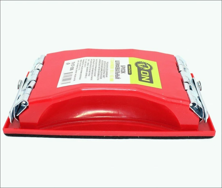 Описание: пластмассовый шлифовальный блок, сделанный из прочной пластмассы, стойкой к ударам. На блоке есть металлический зажим, фиксирующий абразивную сетку или бумагу. Применяется для обработки шпатлёвок и ремонтных грунтов.