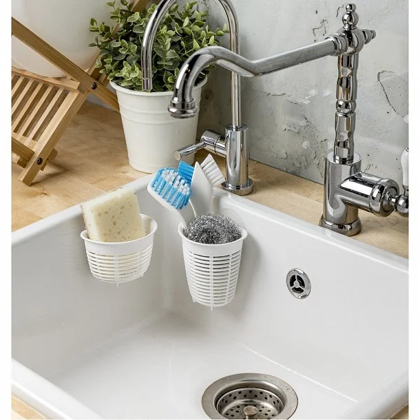 Держатель крепится к поверхности раковины или глянцевому фартуку с помощью присосов или саморезов. Держатель позволяет освободить плоскость возле раковины на кухне и сэкономить место. Хранение губки в держателе позволяет лишней жидкости стекать прямо в раковину и уберегает поверхность столешницы от избыточной влажности, а сетчатое дно держателя обеспечивает быстрое просыхание губки или щётки и предотвращает развитие на них грибка. Держатель продаётся в стильной упаковке, в комплекте идут два присоса. Легко моется, в том числе в посудомоечной машине (без присосов). Изготовлен из полипропилена, не содержит бисфенол А.