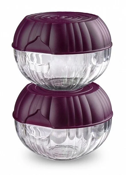Удобная форма позволяет ставить один контейнер на другой, а яркий цвет и крышка с объёмным рисунком, повторяющим фактуру разрезанного лука, поможет всегда отыскать его среди других продуктов.