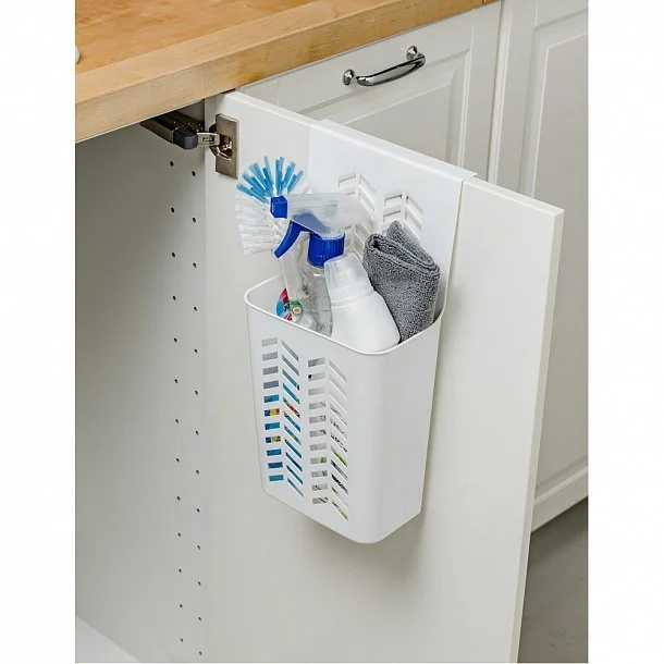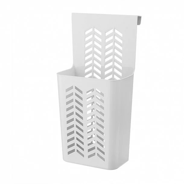 Узкая корзина шириной 17 см крепится на дверцу шкафа или ящик с помощью загнутого верхнего края. Корзина вешается внутрь шкафчика и обеспечивает проветриваемость содержимого благодаря перфорированному корпусу. Удобный органайзер для рабочего стола.