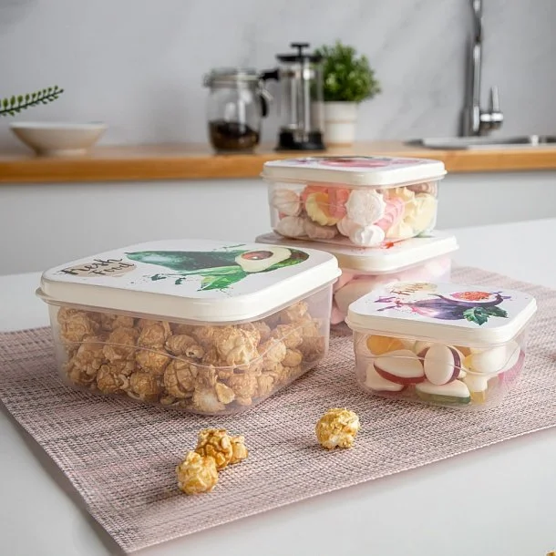 Комплект контейнеров отличается удобством компактного хранения в кухонном шкафу, за счет того, что контейнеры вкладываются друг в друга по принципу матрешки. Крышка контейнеров задекорирована с помощью технологии IML, при которой аппликация вплавляется в изделие на стадии литья. Контейнеры предназначены для хранения и транспортировки различных продуктов. В контейнерах также можно замораживать продукты и разогревать их в микроволновой печи (при открытой крышке). Можно мыть в посудомоечной машине до +95°С.
