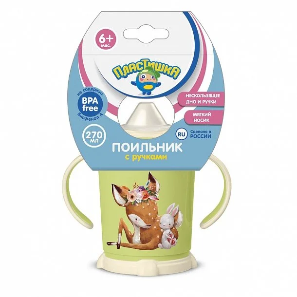 - Поильник с ручками и декором "Пластишка" поможет научить ребенка пить самостоятельно и пригодится в дороге. Мягкий носик не вредит развитию ротовой полости малыша и делает питье очень легким, а специальный колпачок предохраняет носик поильника от грязи и пыли. Обучающие ручки помогут малышу держать поильник самостоятельно, при этом специальное покрытие на ручках и дне поильника предотвратит его скольжение во время использования. Поильник легко разбирается и моется: благодаря простой конструкции внутри не образуется плесень. Сняв крышку, поильник можно использовать как обычную чашку. Декор нанесен с помощью IML-технологии, при которой этикетка вплавляется в изделие, поэтому изображение не стирается в процессе использования.