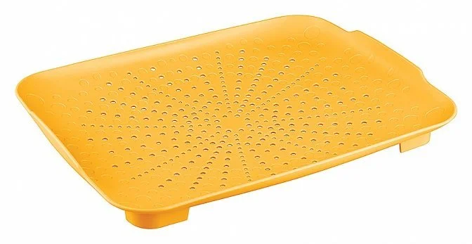 Сушилка-поддон универсальная устанавливается в раковину. На ней удобно мыть фрукты и зелень, а также чистить овощи. Раковина не пачкается и не засоряется.