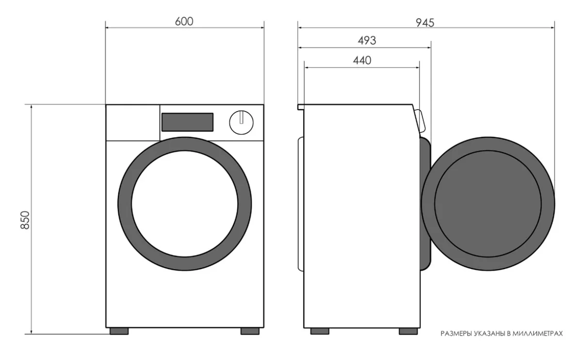 Обратите внимание: габариты стиральной (сушильной) машины указаны по габаритам корпуса. Необходимо учитывать, что выступающие части стиральной (сушильной) машины, такие как крышка люка и элементы/ручки панели управления, а также шланги на задней стенке машинки зачастую требуют небольшого отступа от прилегающих поверхностей (дополнительно около 6 см по глубине).