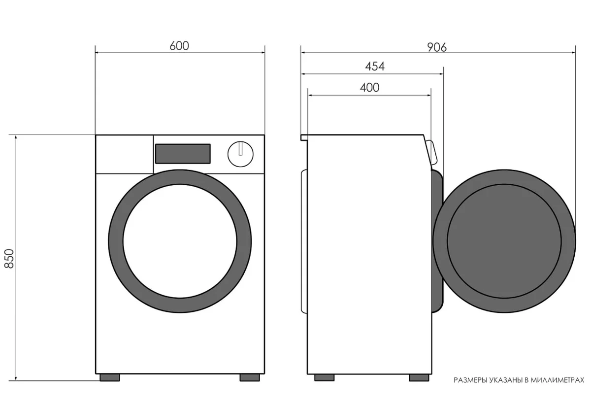 Обратите внимание: габариты стиральной (сушильной) машины указаны по габаритам корпуса. Необходимо учитывать, что выступающие части стиральной (сушильной) машины, такие как крышка люка и элементы/ручки панели управления, а так же шланги на задней стенке машинки зачастую требуют небольшого отступа от прилегающих поверхностей (дополнительно около 6 см по глубине).