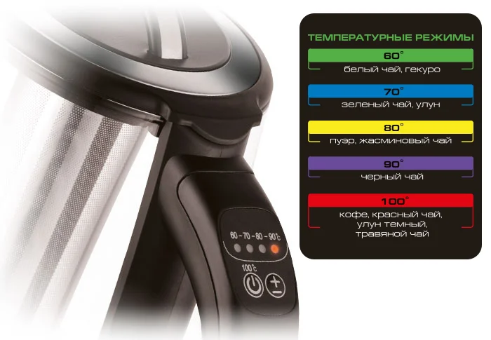 С помощью кнопки (±) Вы можете установить необходимую температуру разогрева. Выбранная температура будет отображаться на соответствующих LED-индикаторах. После закипания чайник автоматически выключится. Подсветка погаснет.