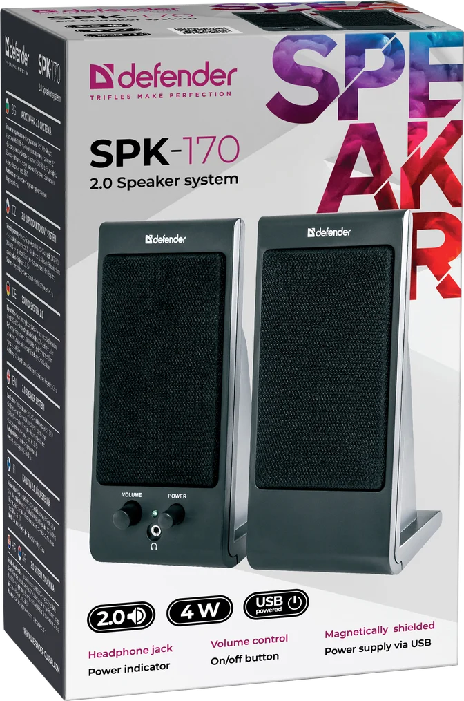 Компактные компьютерные колонки. Регулятор громкости звука, разъем для наушников, магнитная экранировка корпуса