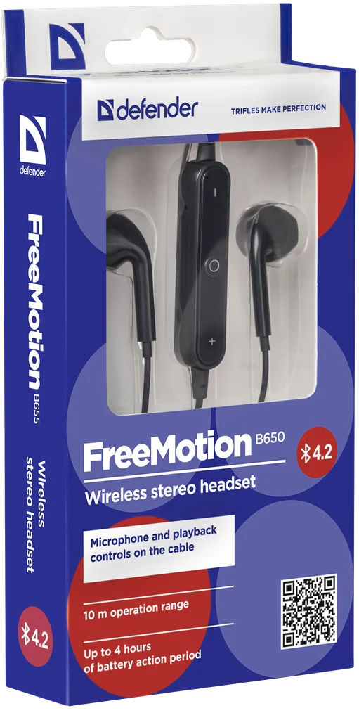Беспроводная гарнитура Defender FreeMotion B650 черный, вставки, Bluetooth