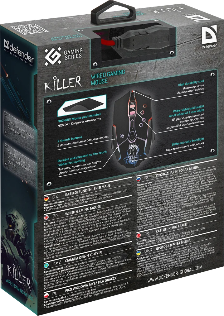 - Кнопка переключения dpi позволяет выбрать скорость перемещения курсора (800/1800/2400/3200 dpi). Выбранный уровень скорости курсора отображается разной интенсивностью подсветки колеса прокрутки.