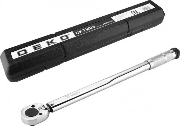 Ключ динамометрический DEKO DKTW03 1/2, 28-210 Нм используется в автомастерских для закручивания резьбовых соединения с нужным крутящим моментом.