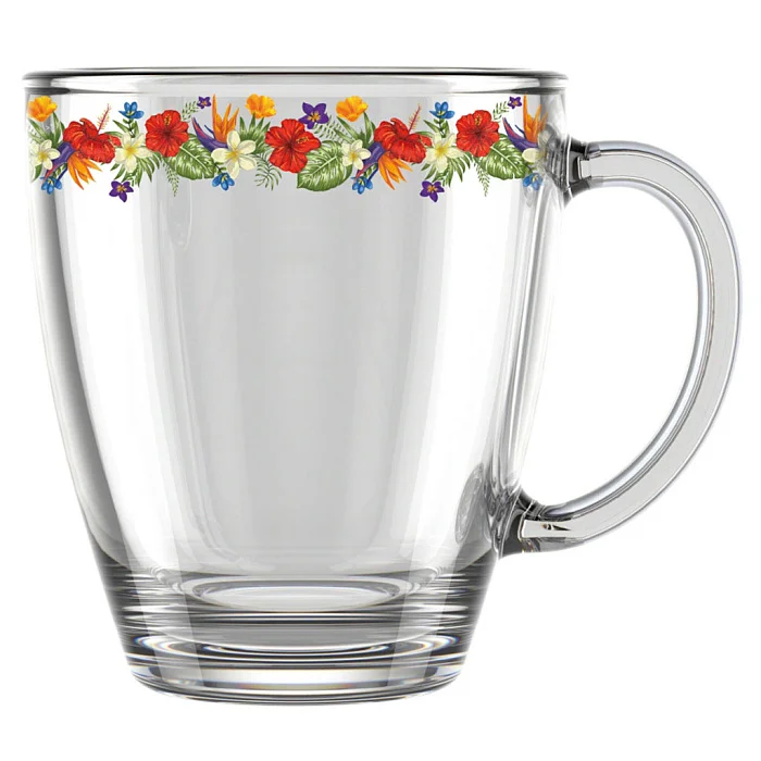- Кружка для чая из высококачественного прозрачного стекла с круговой деколью