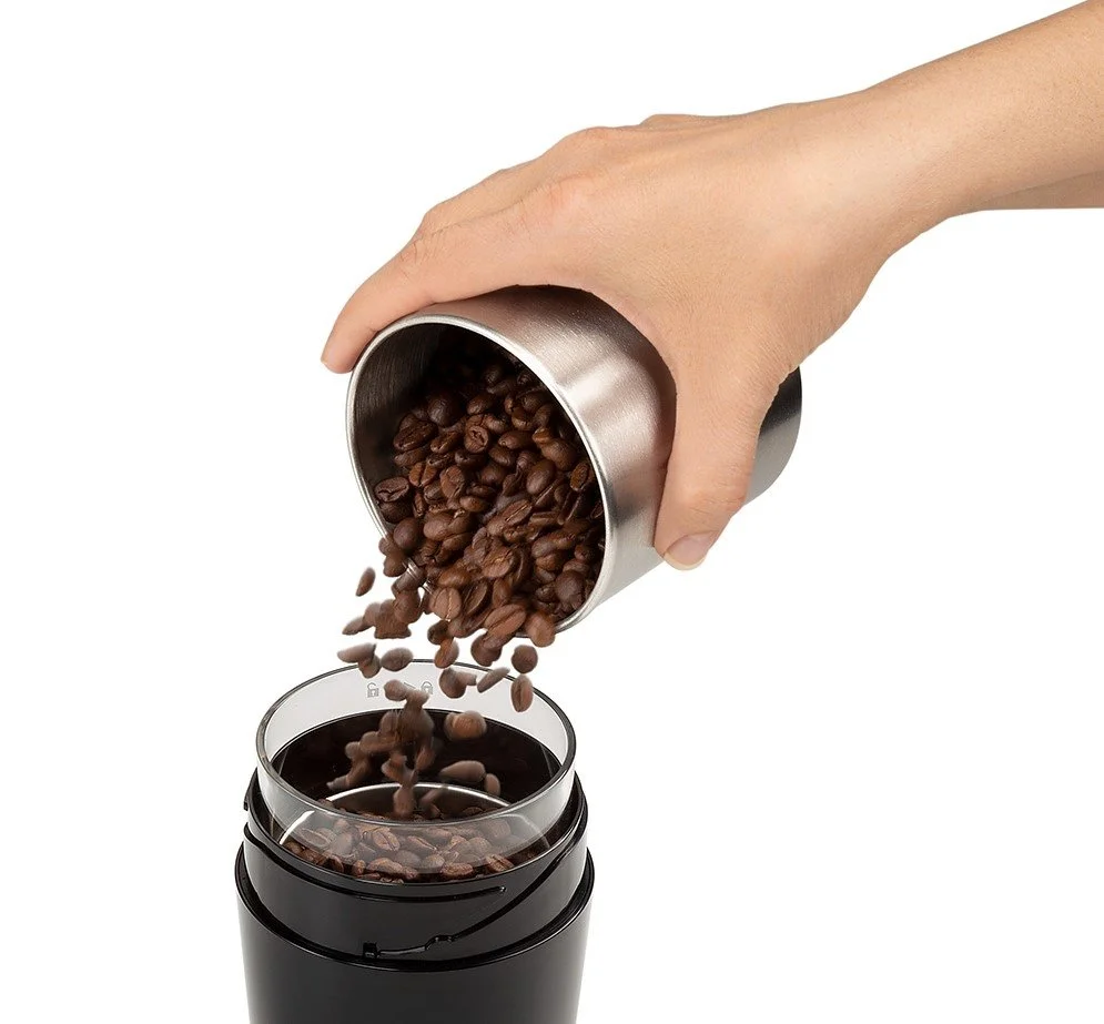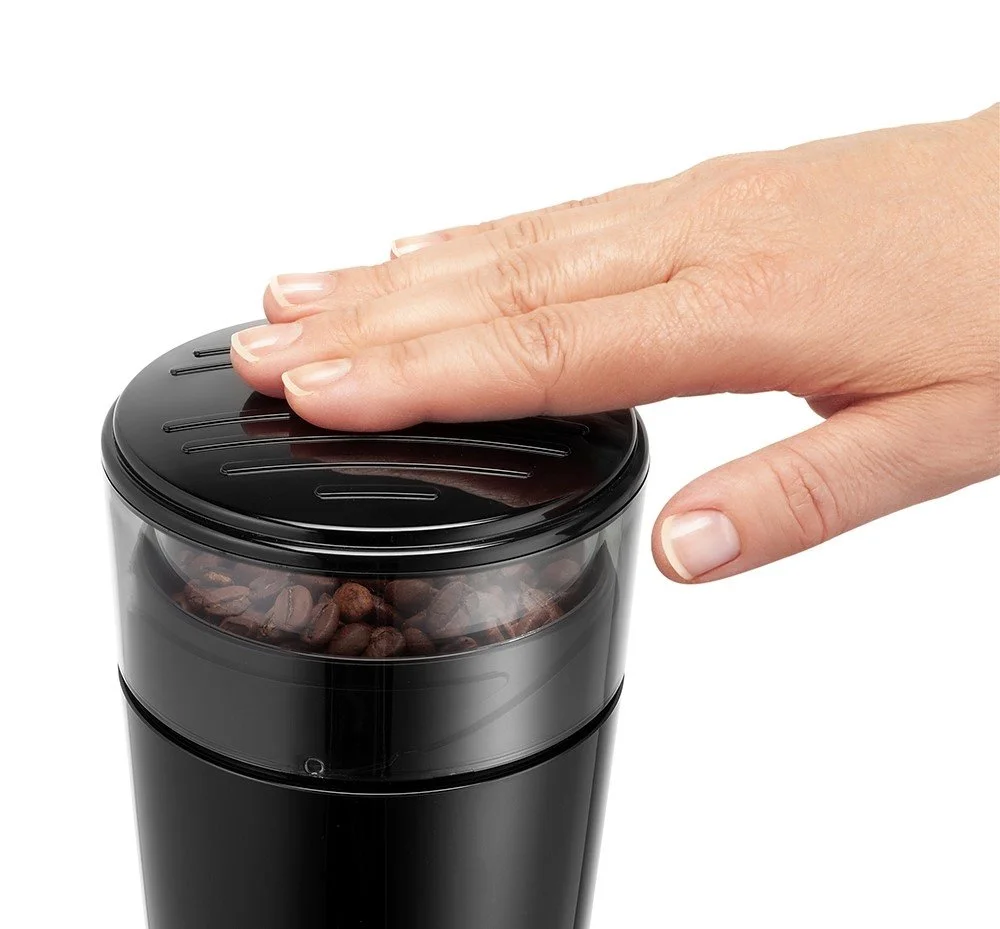 Кофемолка работает только при зажатой кнопке включения. Энергопотребление не превышает 170 Ватт. За раз прибор позволяет перемолоть до 90 гр. кофе, что равноценно 12-ти стандартным порциям эспрессо. Комплектуется щеточкой для быстрой очистки после использования. Среди недостатков роторных кофемолок обычно называют не слишком качественный помол зерен. С DeLonghi KG 200 этой проблемы у вас не возникнет, при условии правильного использования. Пара ножей из нержавеющей стали способны обеспечить их равномерную обработку. Не рекомендуется молоть зерна слишком долго, более 1 минуты. Пользы это не принесет, напротив, зерна могут попросту превратиться в мелкий порошок, сравнимый по консистенции с пылью, что не лучшим образом отразится на вкусе напитка.