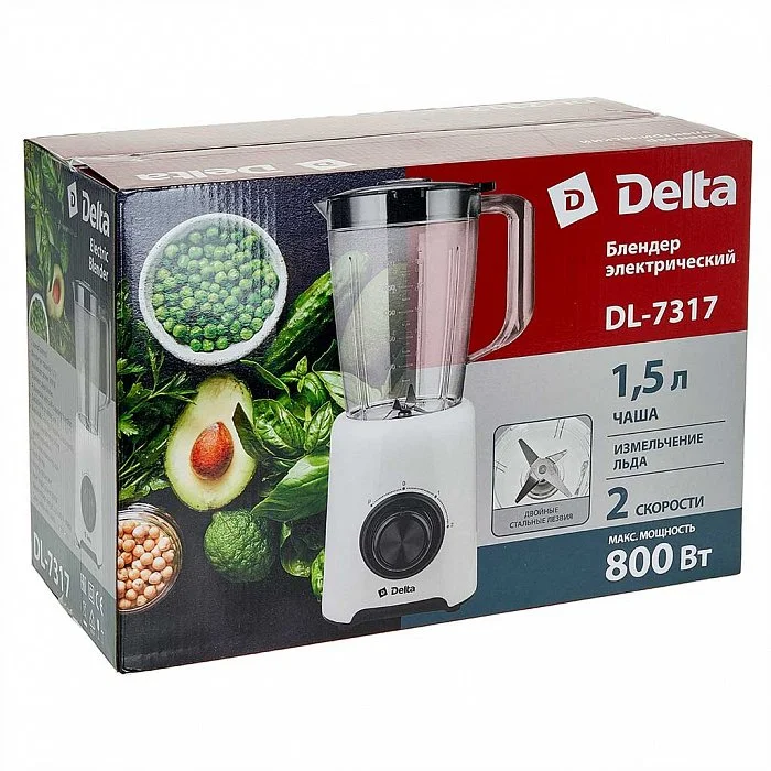 Блендер стационарный 800 Вт, 1,5 л DELTA DL-7317 с пластиковой чашей, белый с черным