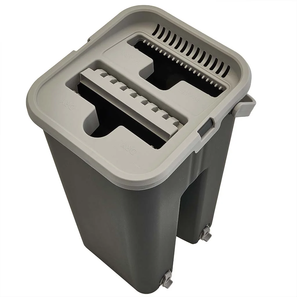 - Уникальная конструкция двухкамерного ведра позволяет отделять грязную воду от чистой, а специальный брызговик на крышке отсека препятствует попаданию загрязнений в чистую воду при отжиме швабры