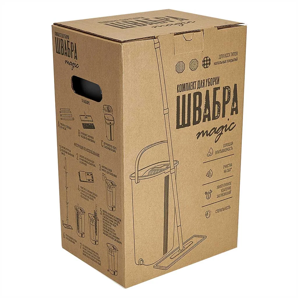 - Инновационный комплект для влажной уборки - это швабра с четырехсоставной разборной рукояткой и насадкой из микрофибры, и ведро с двумя отсеками - емкостью для полоскания и камерой для отжима