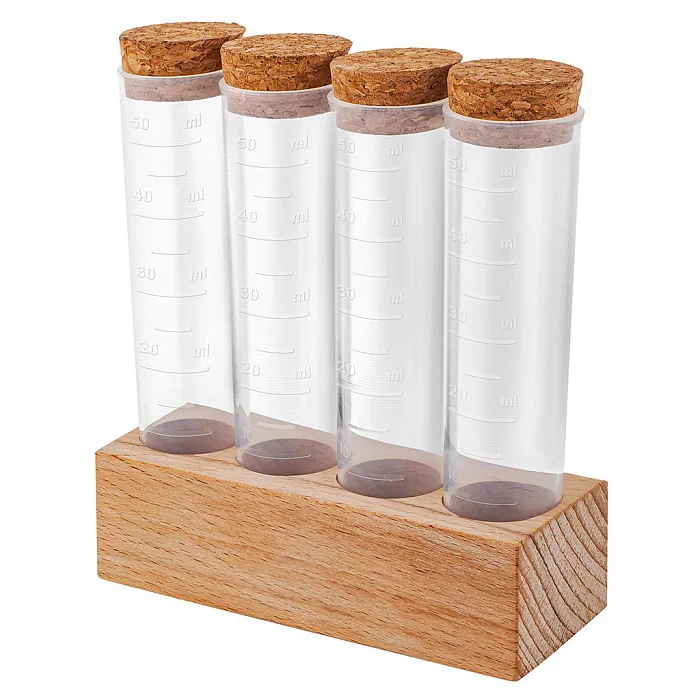 - Компактный набор для хранения специй состоит из 4-х прозрачных пластиковых емкостей объемом по 50 мл с пробковыми крышками на деревянной подставке