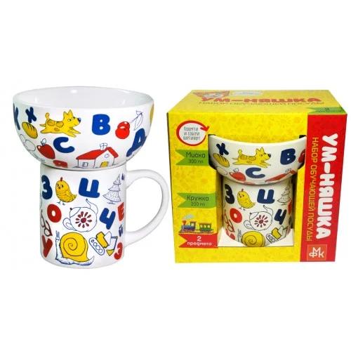 Коллекция детской керамической обучающей посуды "УМ-НЯШКА" с изображением букв русского алфавита с предметами, начинающимися с этих букв. Вашему ребенку будет интересно самому сопоставить букву с предметом.