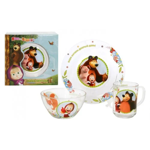 Коллекция стеклянной посуды "Маша и Медведь. Добрый день" с изображением озорной Маши, доброго Медведя и их друзей: свинки и белочки. В состав набора входит кружка 250 мл, салатник 13 см 450 мл, тарелка 19,5 см. Яркая подарочная упаковка с окном. Экологически чистая посуда, безопасная для здоровья и предназначенная для детей старше 3-х лет. Продукцию можно использовать в СВЧ и в посудомоечной машине. Сделано в России.