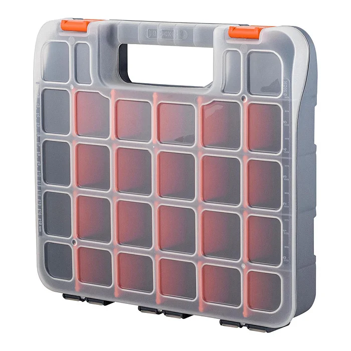 - Внутреннее деление на отсеки делает удобным размещение внутри органайзера деталей, которые необходимо отделить друг от друга