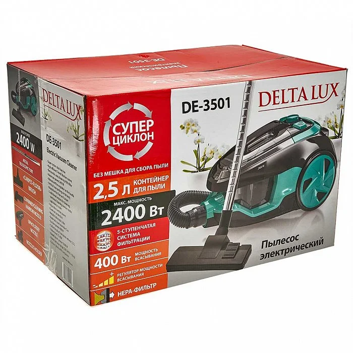 Пылесос 2400 Вт Delta LUX DE-3501 Супер-циклон черный с бирюзовым