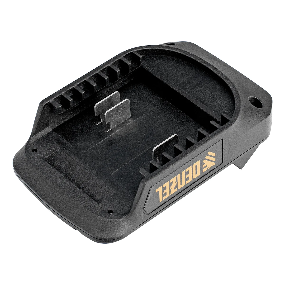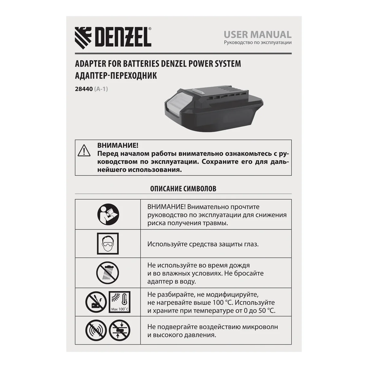 - Простое использование — достаточно присоединить верхнюю часть адаптера к инструменту или зарядному устройству платформы Denzel Power System 18 V, а на нижнюю часть установить аккумулятор Denzel 20 V.