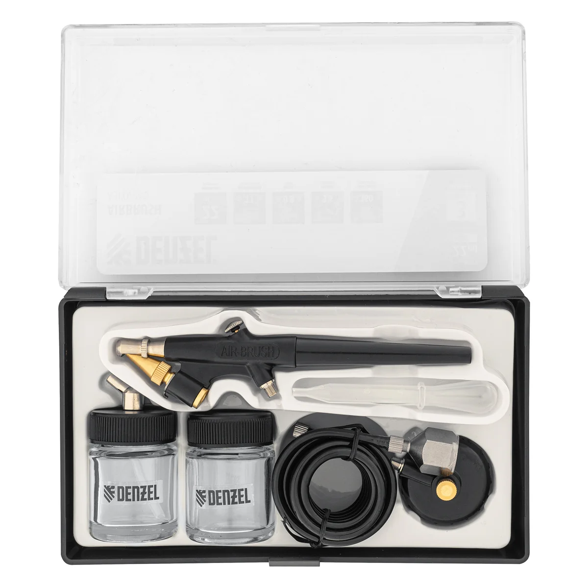 - Продуманная комплектация — аэрограф поставляется с дополнительным бачком, крышкой-переходником и дозатором для краски.