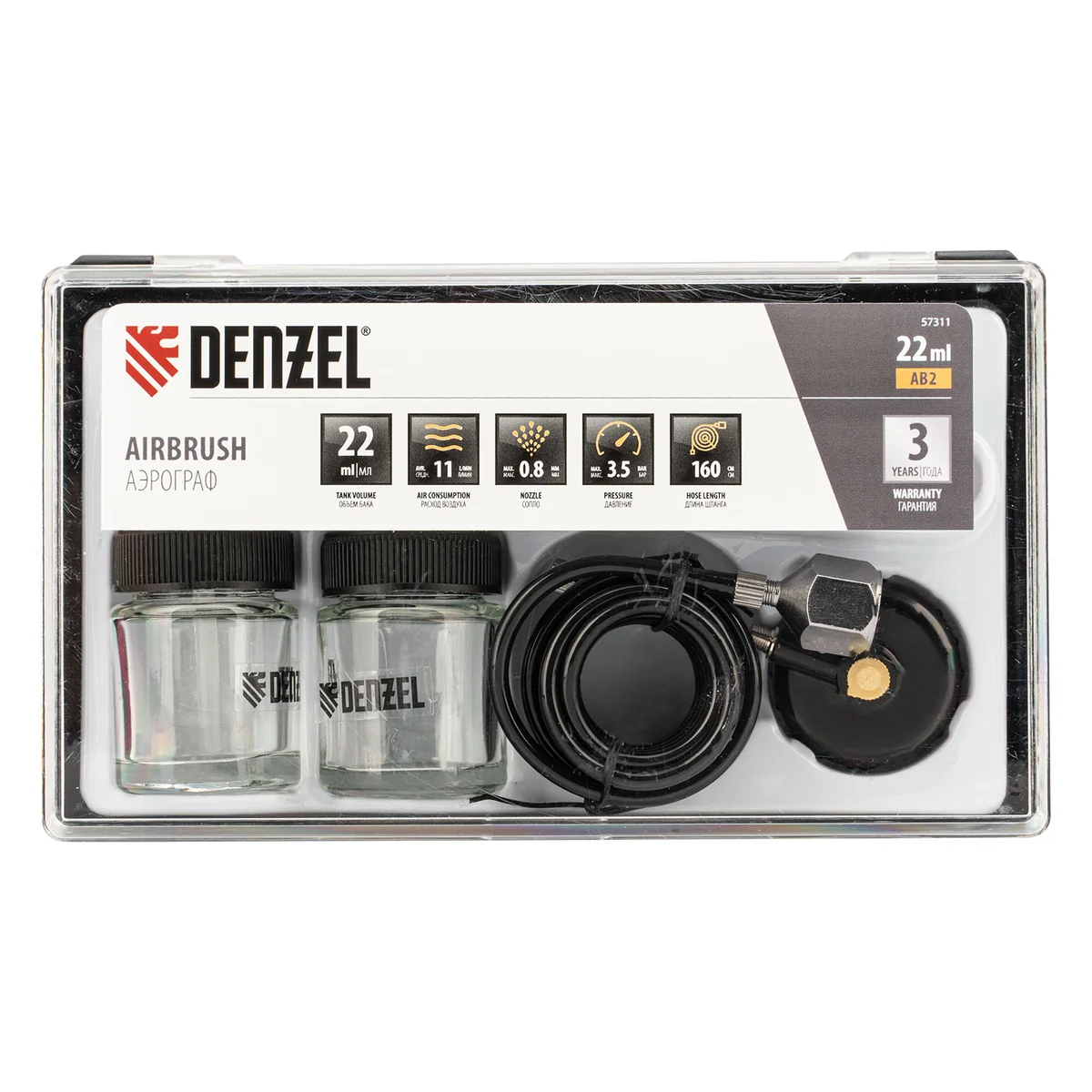 Аэрограф Denzel AB2 57311 с нижним бачком объемом 22 мл расходует 11 л сжатого воздуха в минуту и формирует струю краски диаметром 0,8 мм. Предназначен для выполнения тонких художественно-декоративных и покрасочных работ. Имеет курок одинарного действия: скорость воздушного потока постоянна на протяжении всего времени работы. Аэрограф позволяет создавать рисунки на кузовных элементах автомобилей, мото- и другой техники, а также на прочих поверхностях.