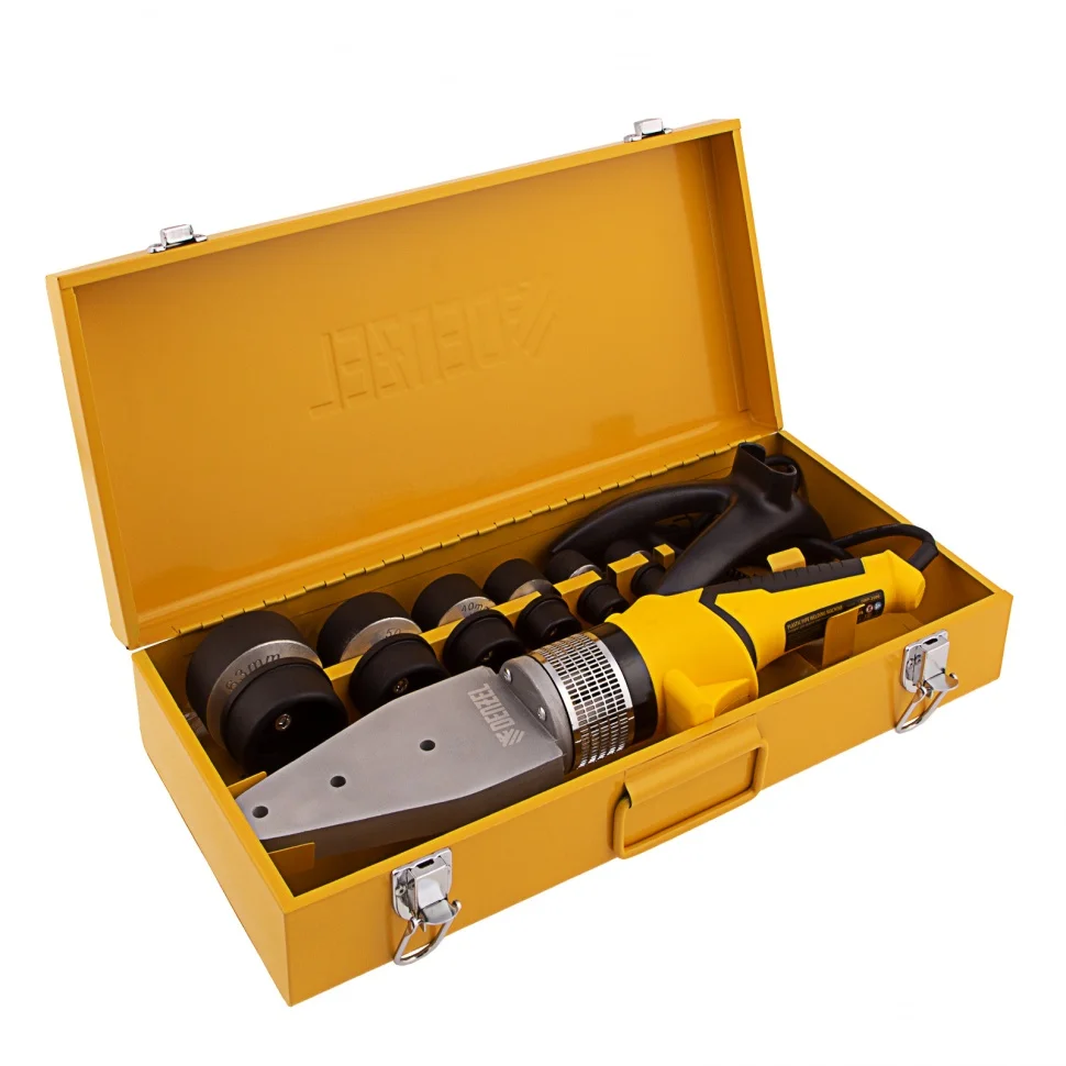 Аппарат для сварки пластиковых труб Denzel DWP-2000 X-PRO 94209 мощностью 2000 Вт, с максимальной температурой 300 ℃, с комплектом насадок диаметром 20-63 мм, предназначен для надежного соединения труб из полипропилена и полиэтилена в бытовых условиях. Мощности 2 кВт достаточно для монтирования систем водоснабжения, отопления и канализации в частных домах и квартирах. Два надежных ТЭНа обеспечивают температуру до 260-300 ℃, в зависимости от выбранного режима.