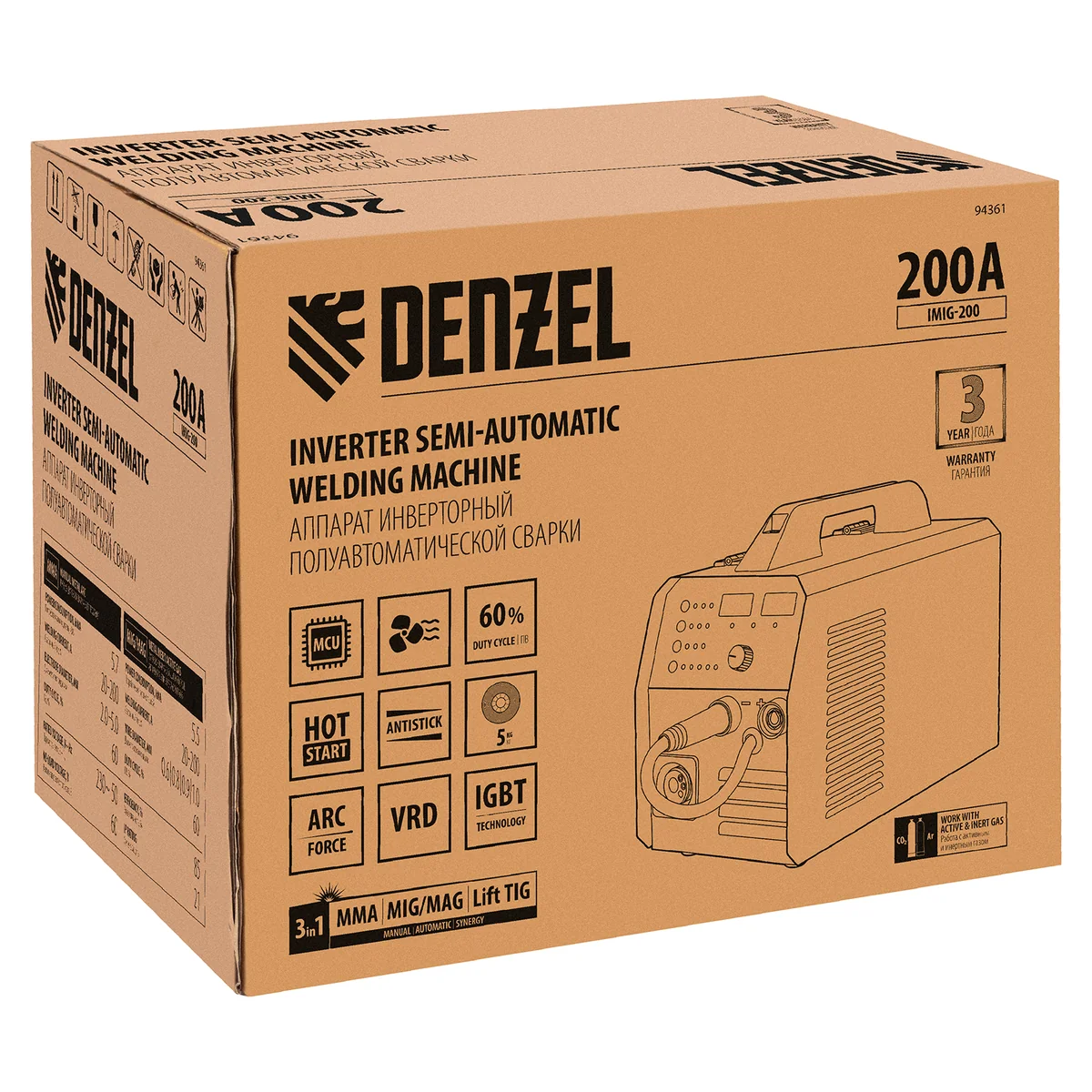 Аппарат инвертор. полуавтомат. cварки IMIG-200, 200 А, ПВ 60%, катушка 5 кг// Denzel 94361