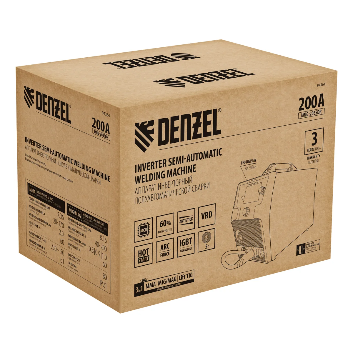 Аппарат инвертор. полуавтомат. cварки IMIG-205SDR, 200 А, ПВ 60%, катушка 5 кг Denzel 94364