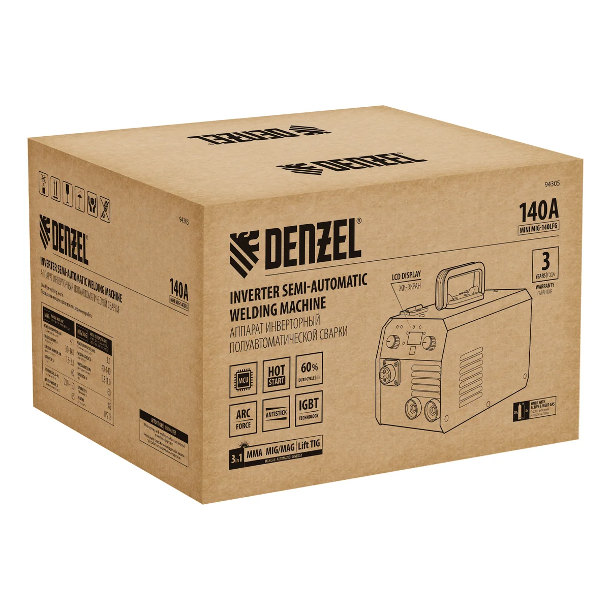 Инверторный аппарат полуавтоматической сварки Denzel Mini MIG-140LFG 94305 предназначен для выполнения сварочных работ при постоянном токе до 140 A и продолжительности включения 60%. Доступные режимы: ручная дуговая сварка покрытым электродом (MMA), сварка в среде защитного газа (MIG/MAG), сварка порошковой (или флюсовой) проволокой диаметром 0,8 / 0,9 / 1, мм (FCAW), а также аргонодуговая сварка неплавящимся электродом (Lift TIG). Горелка TIG не входит в комплект поставки и приобретается отдельно.