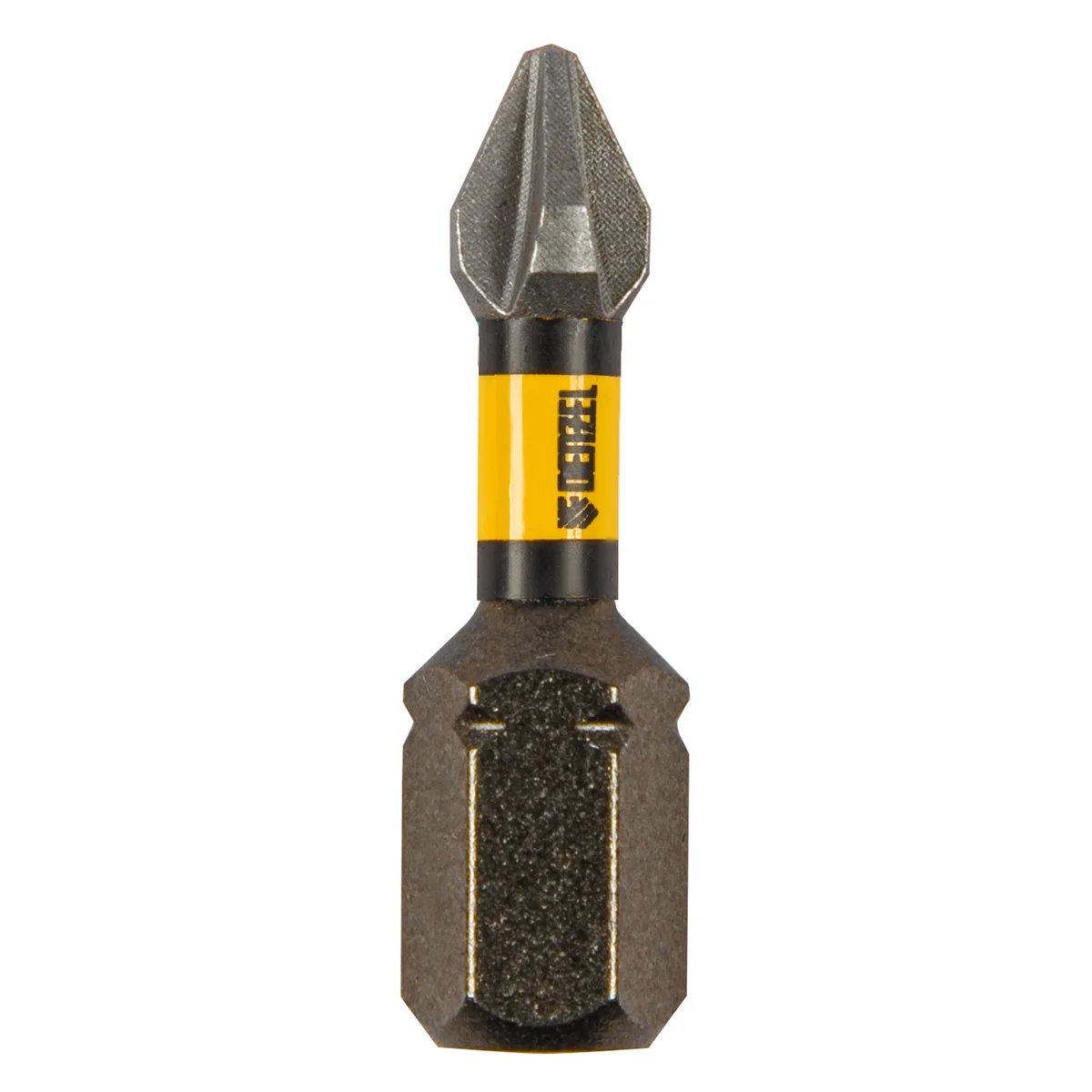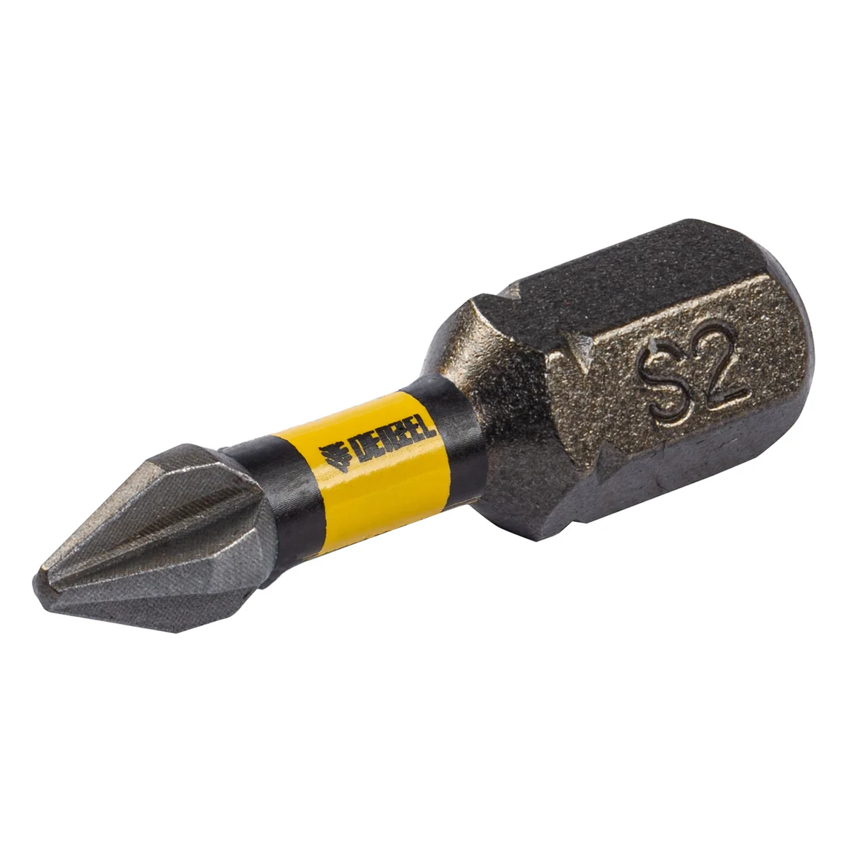 Набор бит торсионных PH1 x 25 мм Denzel 11684 с лазерной обработкой шлица, из стали S2, 10 шт., предназначен для монтажа и демонтажа резьбовых соединений с помощью ударного шуруповерта. Он незаменим в строительных, слесарных и монтажных работах, в автосервисах, при проведении ремонта в доме.Торсионная зона способна пружинить, за счет чего она частично амортизирует тангенциальный удар от шуруповерта. Такое решение позволяет равномерно распределить нагрузку по бите, избежать поломки шлица и в разы увеличить объем работы, проделанный одной насадкой.ПреимуществаПродуманная конструкция — торсионная зона позволяет работать ударным шуруповертом даже с особо твердыми поверхностями без риска поломки бит.Высококачественный материал изготовления — японская легированная сталь S2 обеспечивает устойчивость бит к износу и увеличивает их ресурс.Износостойкость — биты закалены до твердости 62 HRC, что повышает сопротивляемость к деформации при высоких нагрузках.Надежная фиксация — шлицы бит намагничены, поэтому крепеж не выпадет, а мастер сможет свободной рукой придерживать закрепляемый материал.Антикоррозионные свойства — никелированное покрытие увеличивает срок службы насадок.Защита от подделок — цветное кольцо с логотипом ТМ Denzel подтверждает оригинальность товара.Удобное хранение — насадки поставляются в блистере с европодвесом, который можно вешать на стенд.10 бит в комплекте — набора хватит на небольшую производственную бригаду.