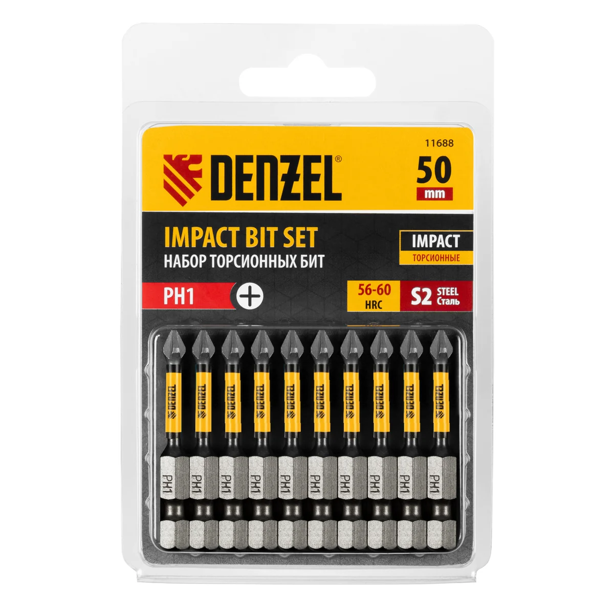 Набор бит торсионных PH1 x 50 мм Denzel 11688 с лазерной обработкой шлица, из стали S2, 10 шт., предназначен для монтажа и демонтажа резьбовых соединений с помощью ударного шуруповерта. Он незаменим в строительных, слесарных и монтажных работах, в автосервисах, при проведении ремонта в доме.Торсионная зона способна пружинить, за счет чего она частично амортизирует тангенциальный удар от шуруповерта. Такое решение позволяет равномерно распределить нагрузку по бите, избежать поломки шлица и в разы увеличить объем работы, проделанный одной насадкой.ПреимуществаПродуманная конструкция — торсионная зона позволяет работать ударным шуруповертом даже с особо твердыми поверхностями без риска поломки бит.Высококачественный материал изготовления — японская легированная сталь S2 обеспечивает устойчивость бит к износу и увеличивает их ресурс.Износостойкость — биты закалены до твердости 62 HRC, что повышает сопротивляемость к деформации при высоких нагрузках.Надежная фиксация — шлицы бит намагничены, поэтому крепеж не выпадет, а мастер сможет свободной рукой придерживать закрепляемый материал.Антикоррозионные свойства — никелированное покрытие увеличивает срок службы насадок.Защита от подделок — цветное кольцо с логотипом ТМ Denzel подтверждает оригинальность товара.Удобное хранение — насадки поставляются в блистере с европодвесом, который можно вешать на стенд.10 бит в комплекте — набора хватит на небольшую производственную бригаду.