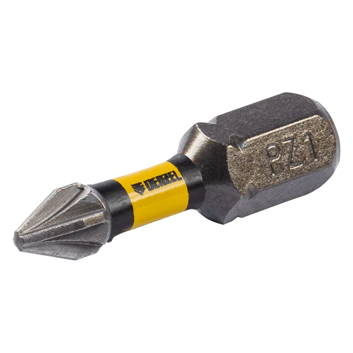 Набор бит торсионных PZ1 x 25 мм Denzel 11686 с лазерной обработкой шлица, из стали S2, 10 шт., предназначен для монтажа и демонтажа резьбовых соединений с помощью ударного шуруповерта. Он незаменим в строительных, слесарных и монтажных работах, в автосервисах, при проведении ремонта в доме.Торсионная зона способна пружинить, за счет чего она частично амортизирует тангенциальный удар от шуруповерта. Такое решение позволяет равномерно распределить нагрузку по бите, избежать поломки шлица и в разы увеличить объем работы, проделанный одной насадкой.ПреимуществаДополнительные выступы между гранями — риск выскальзывания шлица из головки крепежа и поломки сведен к минимуму.Продуманная конструкция — торсионная зона позволяет работать ударным шуруповертом даже с особо твердыми поверхностями без риска поломки бит.Высококачественный материал изготовления — японская легированная сталь S2 обеспечивает устойчивость бит к износу и увеличивает их ресурс.Износостойкость — биты закалены до твердости 62 HRC, что повышает сопротивляемость к деформации при высоких нагрузках.Надежная фиксация — шлицы бит намагничены, поэтому крепеж не выпадет, а мастер сможет свободной рукой придерживать закрепляемый материал.Антикоррозионные свойства — никелированное покрытие увеличивает срок службы насадок.Защита от подделок — цветное кольцо с логотипом ТМ Denzel подтверждает оригинальность товара.Удобное хранение — насадки поставляются в блистере с европодвесом, который можно вешать на стенд.10 бит в комплекте — набора хватит на небольшую производственную бригаду.
