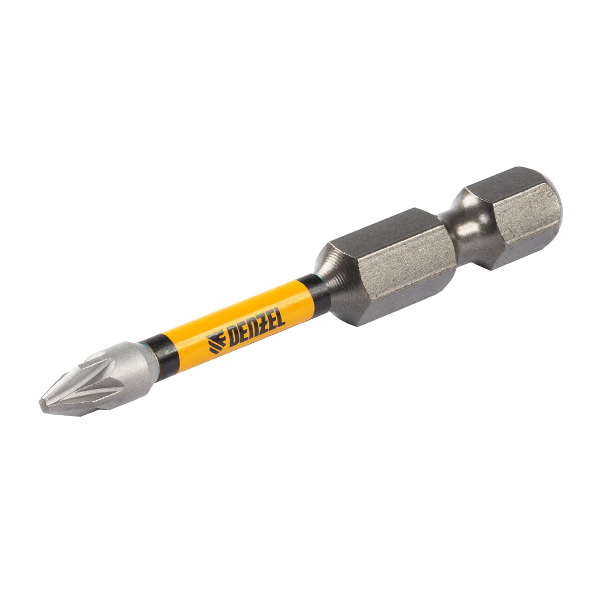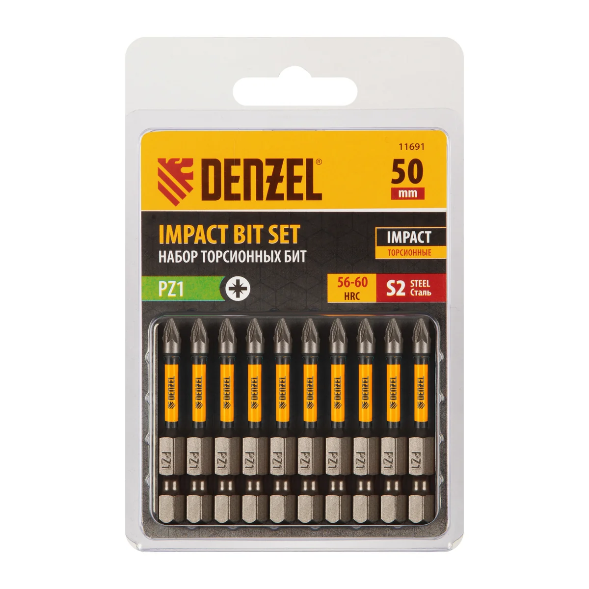 Набор бит торсионных PZ1 x 50 мм Denzel 11691 с лазерной обработкой шлица, из стали S2, 10 шт., предназначен для монтажа и демонтажа резьбовых соединений с помощью ударного шуруповерта. Он незаменим в строительных, слесарных и монтажных работах, в автосервисах, при проведении ремонта в доме.Торсионная зона способна пружинить, за счет чего она частично амортизирует тангенциальный удар от шуруповерта. Такое решение позволяет равномерно распределить нагрузку по бите, избежать поломки шлица и в разы увеличить объем работы, проделанный одной насадкой.ПреимуществаДополнительные выступы между гранями — риск выскальзывания шлица из головки крепежа и поломки сведен к минимуму.Продуманная конструкция — торсионная зона позволяет работать ударным шуруповертом даже с особо твердыми поверхностями без риска поломки бит.Высококачественный материал изготовления — японская легированная сталь S2 обеспечивает устойчивость бит к износу и увеличивает их ресурс.Износостойкость — биты закалены до твердости 62 HRC, что повышает сопротивляемость к деформации при высоких нагрузках.Надежная фиксация — шлицы бит намагничены, поэтому крепеж не выпадет, а мастер сможет свободной рукой придерживать закрепляемый материал.Антикоррозионные свойства — никелированное покрытие увеличивает срок службы насадок.Защита от подделок — цветное кольцо с логотипом ТМ Denzel подтверждает оригинальность товара.Удобное хранение — насадки поставляются в блистере с европодвесом, который можно вешать на стенд.10 бит в комплекте — набора хватит на небольшую производственную бригаду.