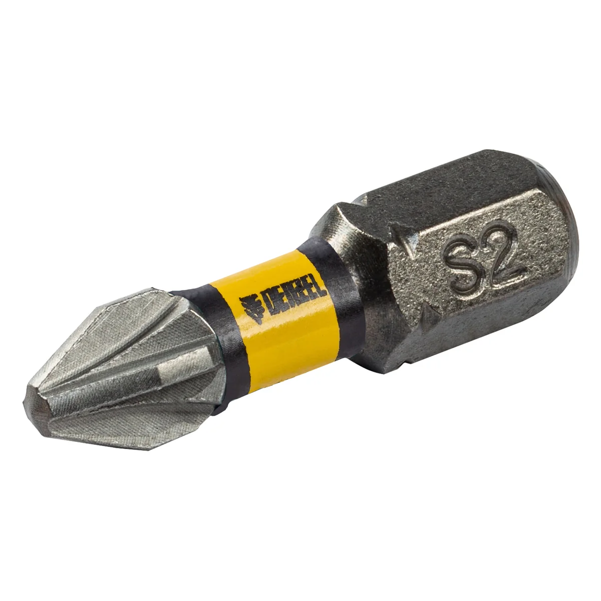 Набор бит торсионных PZ2 x 25 мм Denzel 11687 с лазерной обработкой шлица, из стали S2, 10 шт., предназначен для монтажа и демонтажа резьбовых соединений с помощью ударного шуруповерта. Он незаменим в строительных, слесарных и монтажных работах, в автосервисах, при проведении ремонта в доме.Торсионная зона способна пружинить, за счет чего она частично амортизирует тангенциальный удар от шуруповерта. Такое решение позволяет равномерно распределить нагрузку по бите, избежать поломки шлица и в разы увеличить объем работы, проделанный одной насадкой.ПреимуществаДополнительные выступы между гранями — риск выскальзывания шлица из головки крепежа и поломки сведен к минимуму.Продуманная конструкция — торсионная зона позволяет работать ударным шуруповертом даже с особо твердыми поверхностями без риска поломки бит.Высококачественный материал изготовления — японская легированная сталь S2 обеспечивает устойчивость бит к износу и увеличивает их ресурс.Износостойкость — биты закалены до твердости 62 HRC, что повышает сопротивляемость к деформации при высоких нагрузках.Надежная фиксация — шлицы бит намагничены, поэтому крепеж не выпадет, а мастер сможет свободной рукой придерживать закрепляемый материал.Антикоррозионные свойства — никелированное покрытие увеличивает срок службы насадок.Защита от подделок — цветное кольцо с логотипом ТМ Denzel подтверждает оригинальность товара.Удобное хранение — насадки поставляются в блистере с европодвесом, который можно вешать на стенд.10 бит в комплекте — набора хватит на небольшую производственную бригаду.