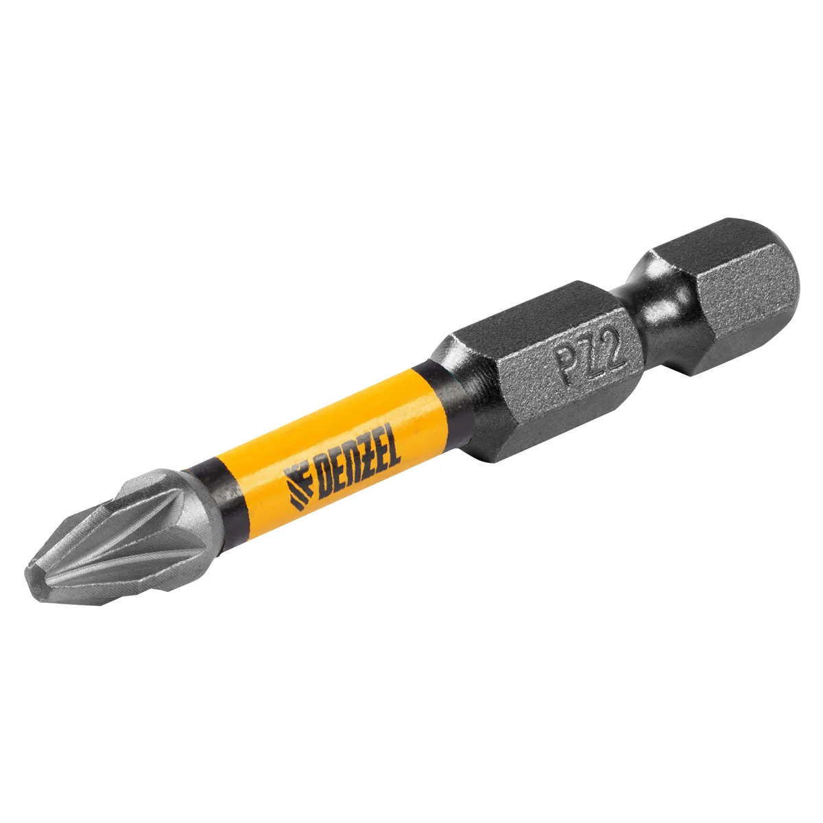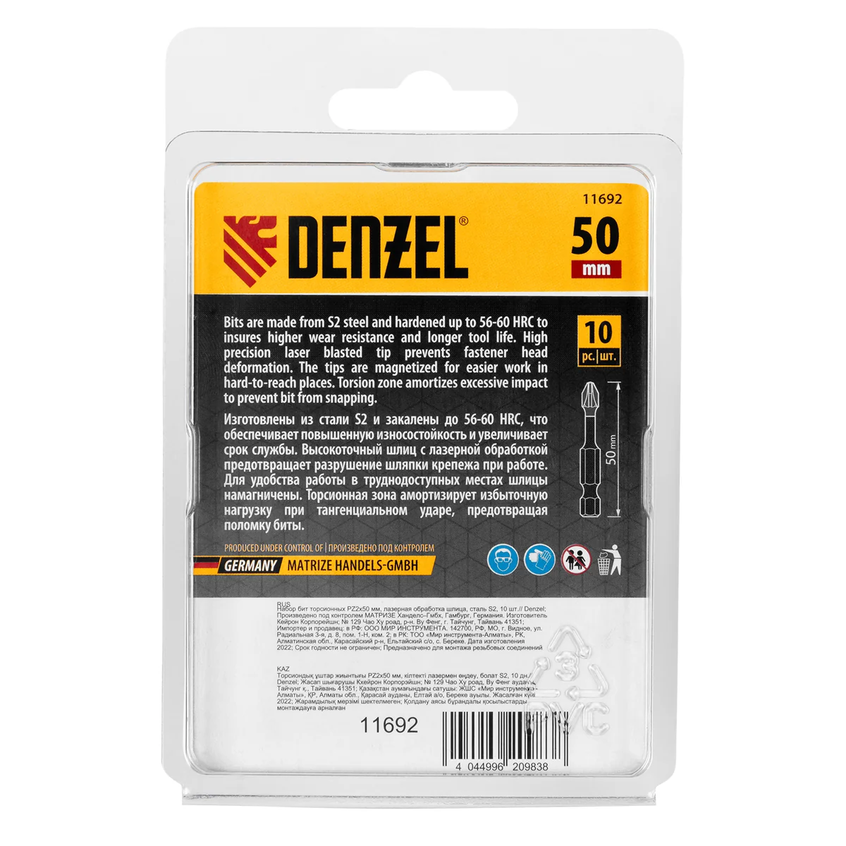 Набор бит торсионных PZ2 x 50 мм Denzel 11692 с лазерной обработкой шлица, из стали S2, 10 шт., предназначен для монтажа и демонтажа резьбовых соединений с помощью ударного шуруповерта. Он незаменим в строительных, слесарных и монтажных работах, в автосервисах, при проведении ремонта в доме.Торсионная зона способна пружинить, за счет чего она частично амортизирует тангенциальный удар от шуруповерта. Такое решение позволяет равномерно распределить нагрузку по бите, избежать поломки шлица и в разы увеличить объем работы, проделанный одной насадкой.ПреимуществаДополнительные выступы между гранями — риск выскальзывания шлица из головки крепежа и поломки сведен к минимуму.Продуманная конструкция — торсионная зона позволяет работать ударным шуруповертом даже с особо твердыми поверхностями без риска поломки бит.Высококачественный материал изготовления — японская легированная сталь S2 обеспечивает устойчивость бит к износу и увеличивает их ресурс.Износостойкость — биты закалены до твердости 62 HRC, что повышает сопротивляемость к деформации при высоких нагрузках.Надежная фиксация — шлицы бит намагничены, поэтому крепеж не выпадет, а мастер сможет свободной рукой придерживать закрепляемый материал.Антикоррозионные свойства — никелированное покрытие увеличивает срок службы насадок.Защита от подделок — цветное кольцо с логотипом ТМ Denzel подтверждает оригинальность товара.Удобное хранение — насадки поставляются в блистере с европодвесом, который можно вешать на стенд.10 бит в комплекте — набора хватит на небольшую производственную бригаду.