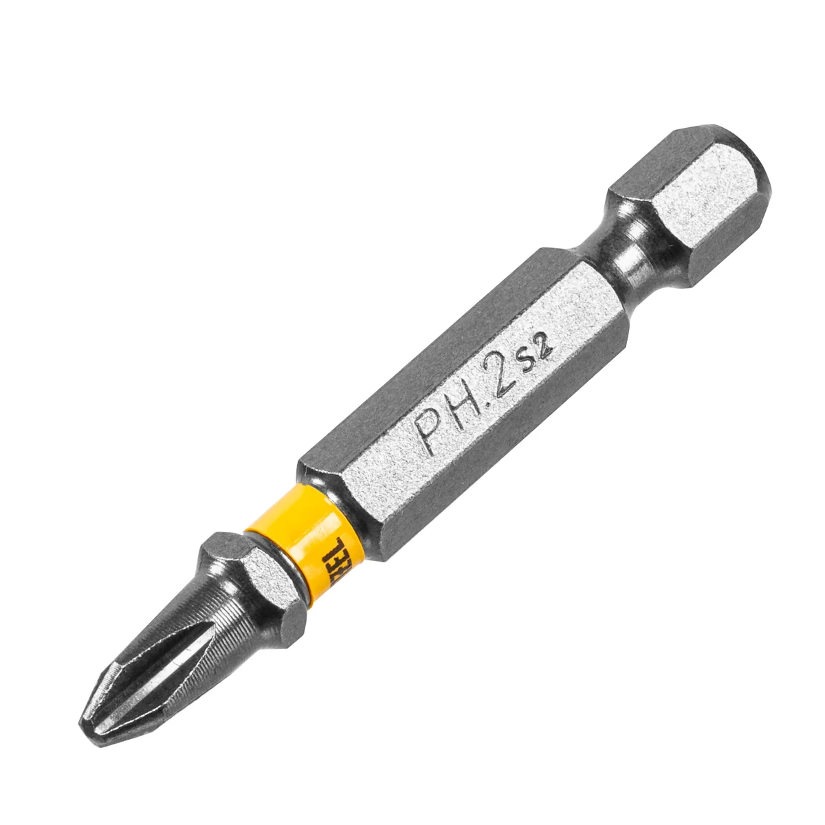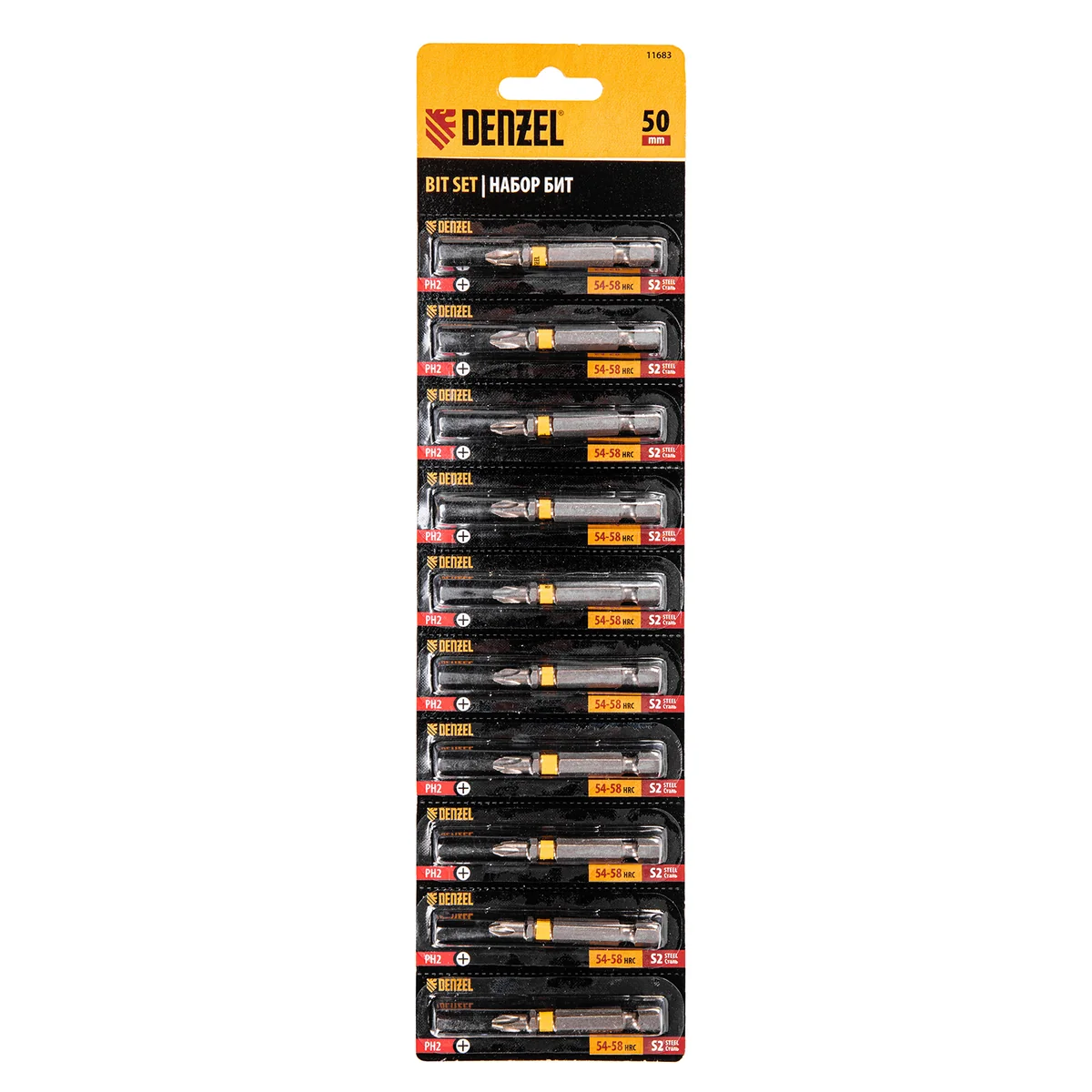 Набор бит PH2 x 50 мм Denzel 11683, поставляющийся в пластиковой коробке, состоит из 10 сменных насадок из легированной стали S2, с крестообразными шлицами и шестигранными хвостовиками 1/4"". Оснастка используется при работе шуруповертом, подходит для профессионального применения. Биты обеспечивают быстрый монтаж и демонтаж резьбовых соединений с углублением PH2.ПреимуществаДолговечность и устойчивость к большим нагрузкам — биты изготовлены из японской легированной стали S2 повышенной прочности, закаленной до твердости 60 HRC.Эффективная работа — биты не проскальзывают в головке крепежа, их грани не «слизываются», что усиливает контроль при работе с саморезами по дереву и значительно увеличивает срок службы насадок.Антикоррозийная защита — каждая насадка имеет никелированное покрытие.Высокая результативность даже в ограниченном пространстве — благодаря удлиненному до 50 мм профилю битами удобно работать в труднодоступных местахКомфортное использование — намагниченный шлиц удерживает крепеж, поэтому свободной рукой можно придерживать закрепляемую поверхность.10 штук в наборе — бит хватит на целую бригаду.Удобная отрывная упаковка — можно использовать нужное количество насадок, не распаковывая весь набор.