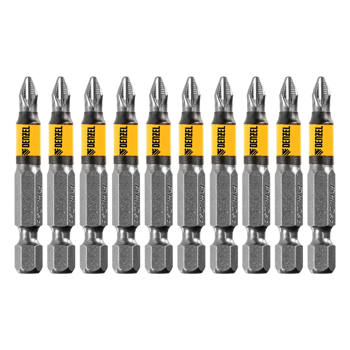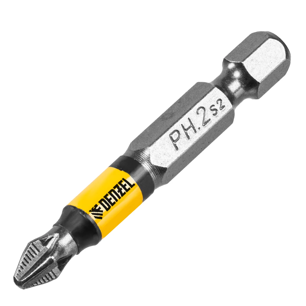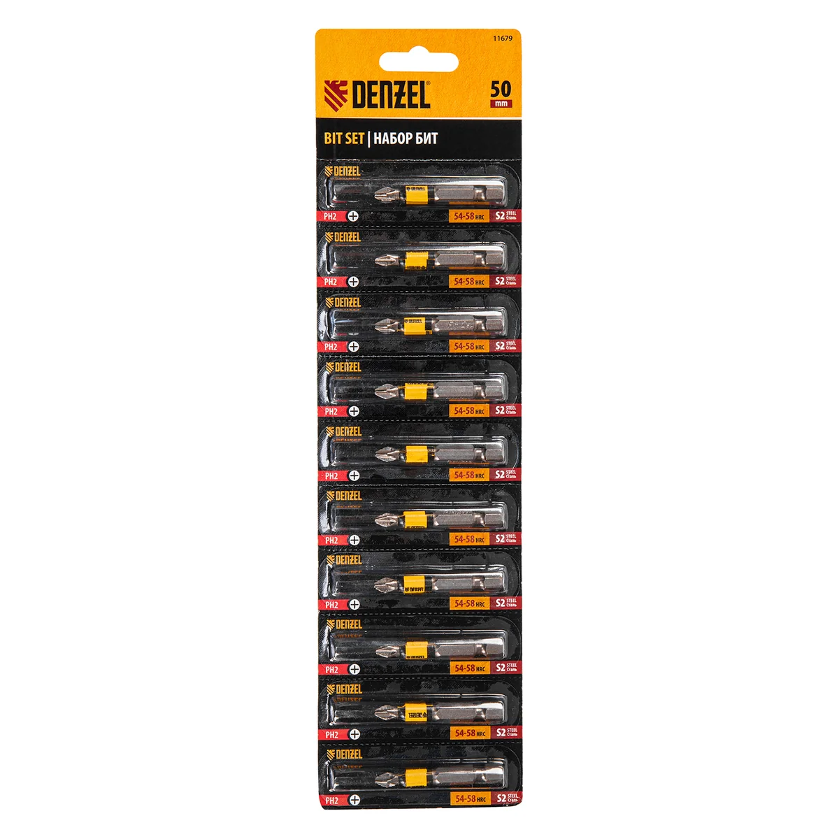 Набор бит PH2 х 50 мм Denzel 11679 состоит из 10 наиболее востребованных крестообразных насадок из легированной стали S2, с хвостовиком 1/4"", и предназначен для шуруповертов и отверток-адаптеров. Биты используются при монтаже и демонтаже большинства саморезов по дереву, шурупов и др. За счет оптимальной геометрии биты способны ввинтить и извлечь большое количество крепежа без потери рабочих свойств.ПреимуществаУстойчивость к деформации при высоких нагрузках — биты изготовлены из японской легированной стали S2 и закалены до твердости 60 HRC.Высокоточное исполнение — оптимальная геометрия шлица и максимальный контроль на производстве в Тайване позволили добиться выверенности каждой биты и предотвратить проскальзывание рабочей части в головке крепежа.Удобная эксплуатация — намагниченный шлиц облегчает работу и позволяет направлять шуруповерт с насаженным крепежом одной рукой, а другой придерживать закрепляемую деталь.Антикоррозионные свойства — никелированное покрытие увеличивает срок службы насадок.Защита от подделок — цветное кольцо с логотипом ТМ Denzel на каждой бите подтверждает оригинальность товара.10 бит в комплекте — набора хватит на целую бригаду.Удобная отрывная упаковка — можно использовать нужное количество насадок, не распаковывая весь набор.