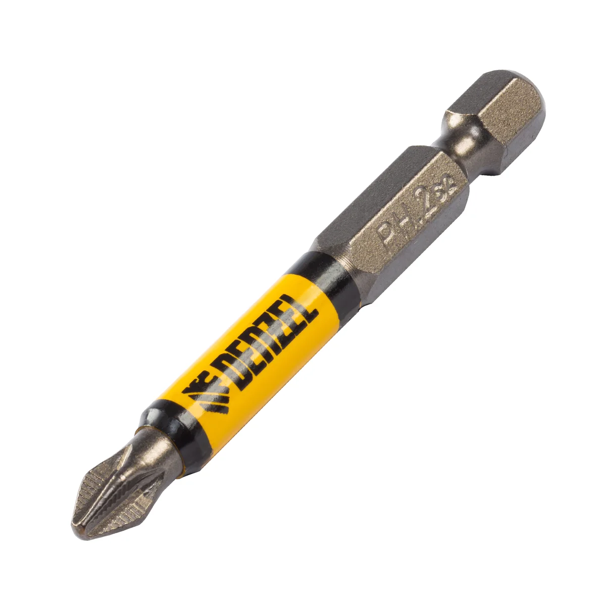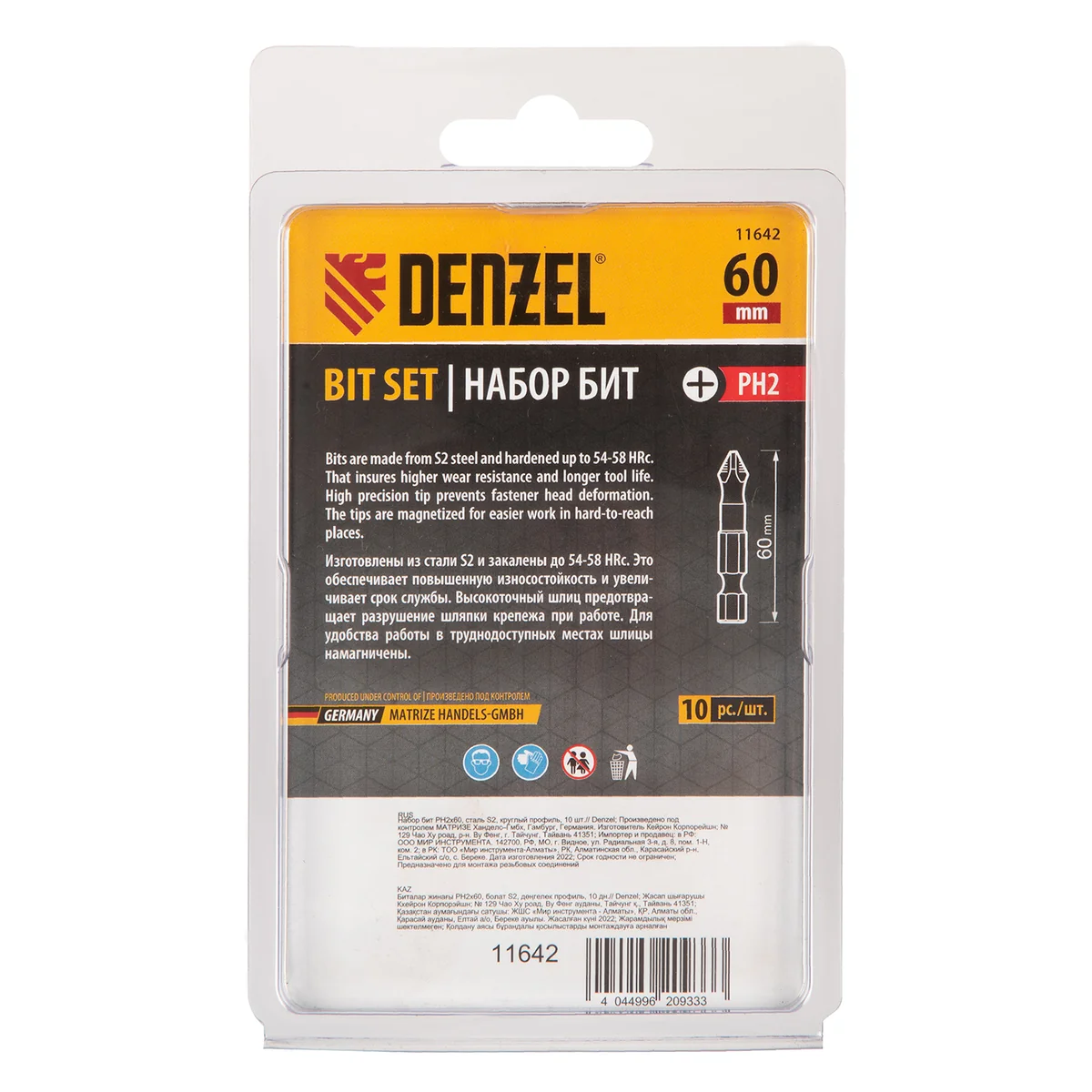 Набор бит PH2x60 Denzel 11642 состоит из 10 сменных односторонних насадок из стали S2, с круглым профилем и крестообразными шлицами, с шестигранными хвостовиками 1/4"". Профессиональная оснастка рассчитана на работу с шуруповертом, обеспечивает быстрый монтаж и демонтаж резьбовых соединений с углублением PH2.ПреимуществаДолговечность — насечки на шлице препятствуют проскальзыванию и «слизыванию» бит, дополнительно усиливают контроль при работе с саморезами по дереву.Высокая результативность даже в ограниченном пространстве — благодаря профилю длиной 60 мм битами удобно работать в труднодоступных местах.Устойчивость к деформации при больших нагрузках — биты изготовлены из японской легированной стали S2 повышенной прочности и закалены до твердости 60 HRC.Намагниченный шлиц облегчает работу — крепеж удерживается битой, поэтому свободной рукой можно придерживать закрепляемую поверхность.Антикоррозионные свойства — никелированное покрытие увеличивает срок службы насадок.10 бит в комплекте — набора хватит на целую бригаду.Удобная упаковка — оснастка поставляется в двойном блистере с европодвесом.